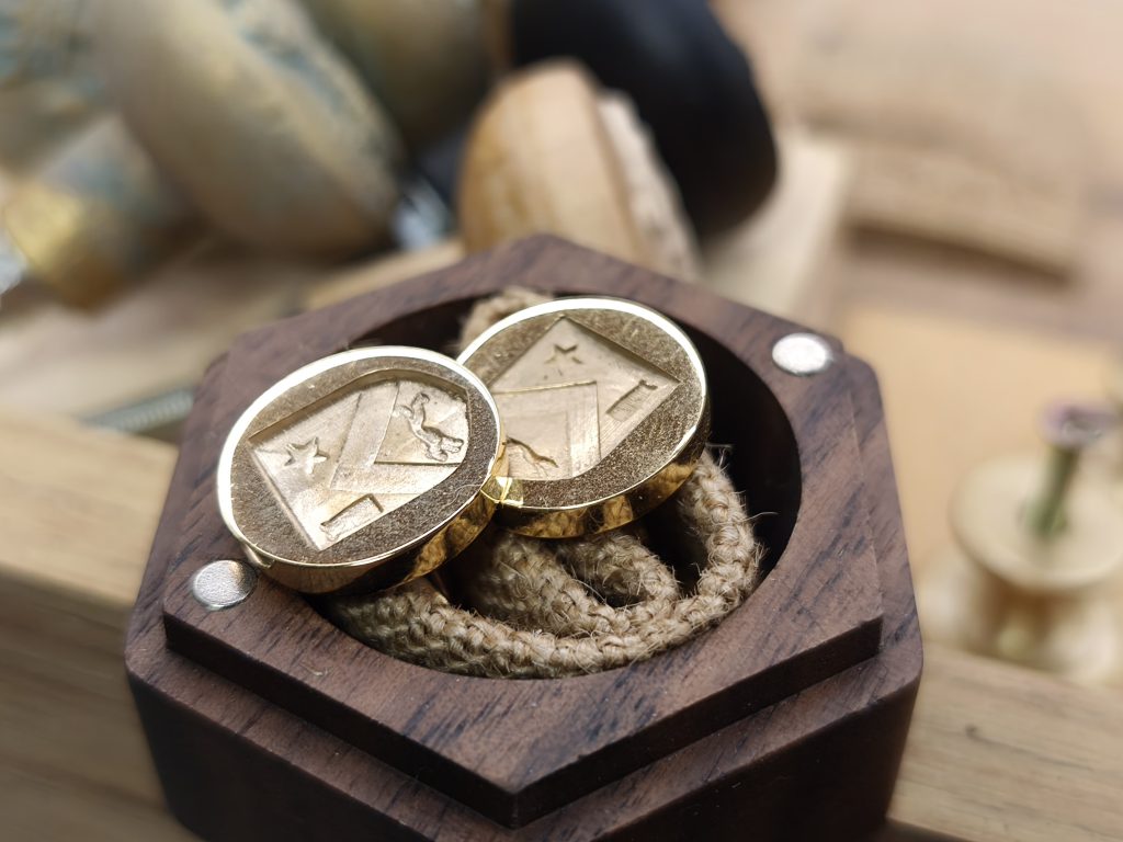 Élégamment réalisés en laiton doré, ils peuvent être gravés en creux – que ce soit un simple écu, une couronne ou un heaume – selon la composition de vos armes. Pour les blasons plus élaborés, une version en relief est parfois envisageable, offrant un jeu de volumes subtil et raffiné.