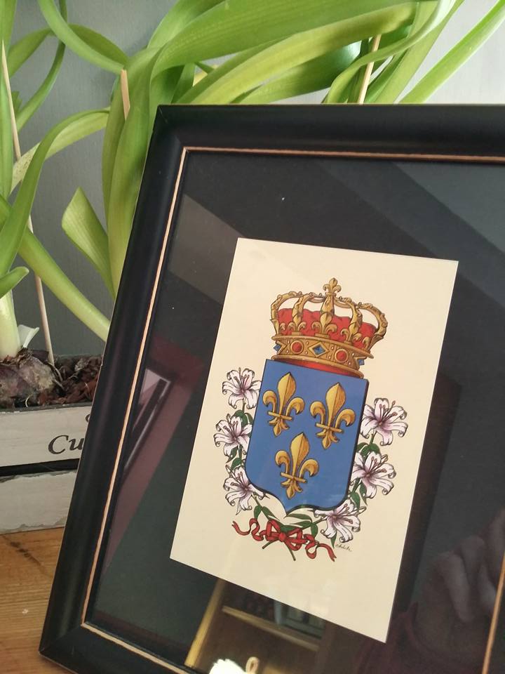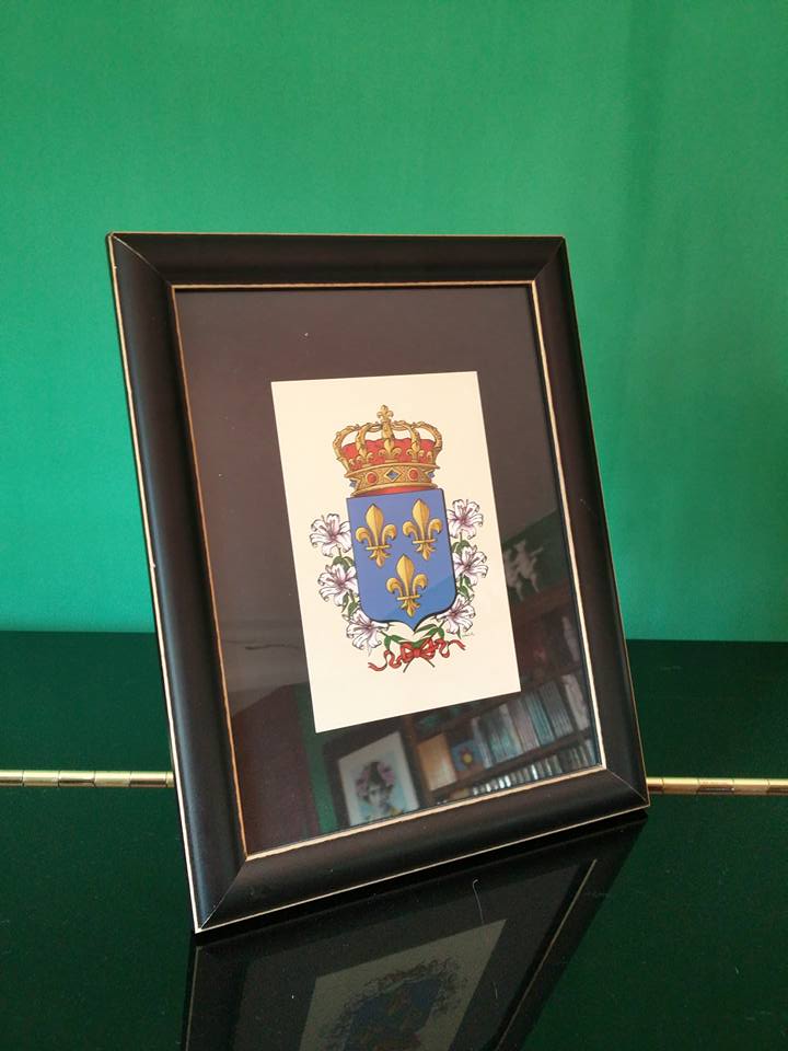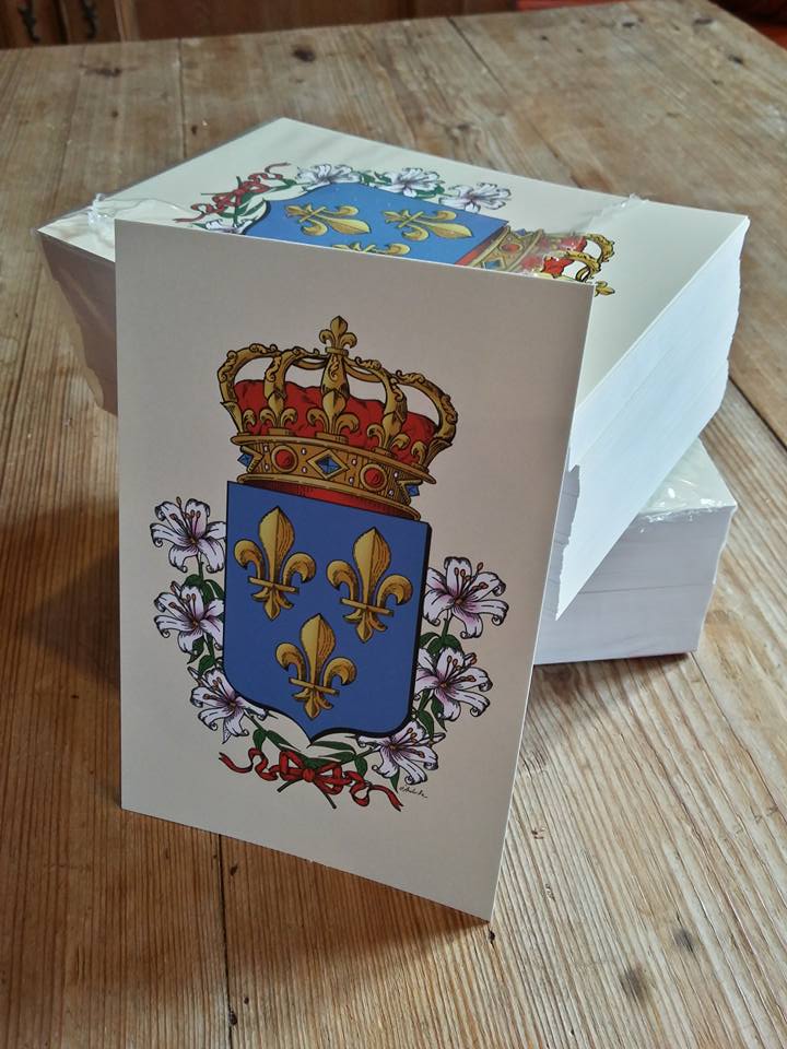 imprimées sur une carte papier couché de 350g, fond crème, finition mate, d’azur à trois lys d’or, couronne royale, 3 lys au naturel de chaque côté, liés par un ruban de gueules pour faire écho au bonnet de la couronne. carte livrée avec une enveloppe. prête à être envoyée ou encadrée !