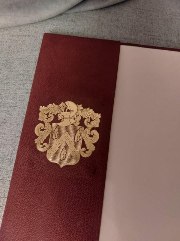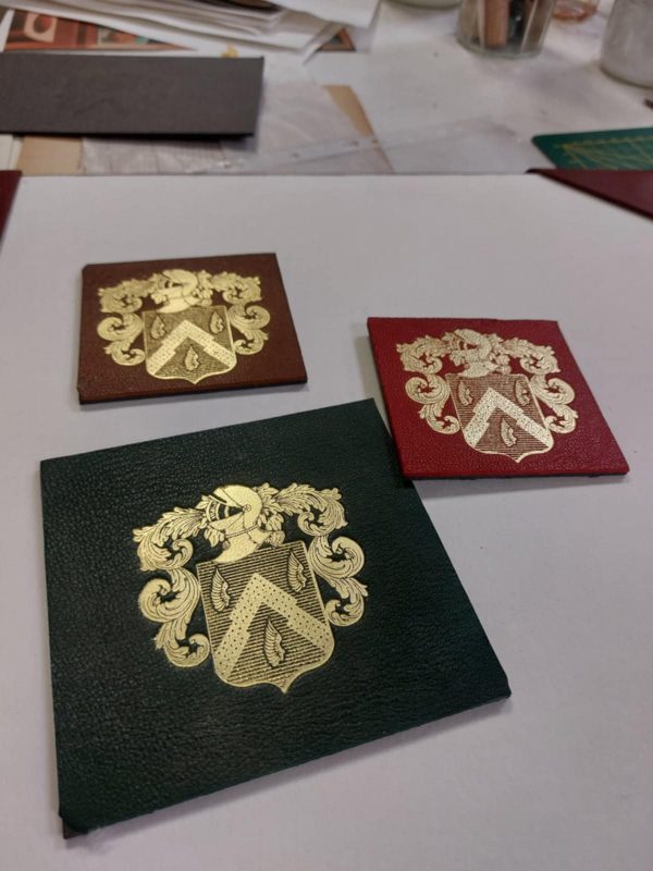 Le doreur chauffe le fer, le positionne avec précision, puis presse le motif pour révéler une empreinte fine et brillante. La maîtrise du geste, du temps de chauffe et de la pression conditionne la perfection du résultat.