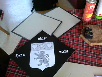 OBIIT (forme raccourcie du Latin obivit qui signifie « il est mort) Je vous propose de réaliser votre obiit (tableau funéraire réalisé dans un losange noir), soit peint, soit imprimé en petit modèle pour la célébration funéraire. voici une progression d’une impression. Vous trouverez aussi dans la galerie des obbits pour accompagner un drap mortuaire (me contacter).